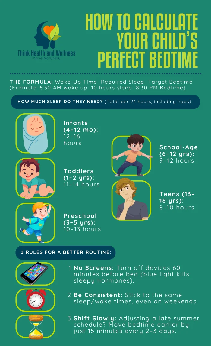 This guide covers how much sleep kids need by age, how to calculate a realistic bedtime, signs that your child is not getting enough sleep, and simple healthy sleep habits that support better rest year-round.